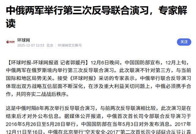 结语 眼下的日本,正站在一个十字路口上,空中有对峙,外交被冷落,经济受掣肘,连最信任的盟友都开始沉默,这一连串的压力不是偶然发生,而是政策推动下的必然结果。 中国没有主动挑衅,却用一连串有节奏的反应明确划出红线,军事反制、外交表态、经济管控,一个不落,这些回应不是情绪化的爆发,而是制度化、常态化的战略反制。 如果日本继续在错误的方向上加码,最终受伤的也不会只是地区安全,更可能是它自己的长远利益,历史的回声已经响起,是选择听进去,还是继续装聋作哑,就看日本未来怎么走了。 视频丨日本误导国际社会、加速西南军事化部署有何用意?2025-12-0900:53·央视新闻 中俄两军举行第三次反导联合演习,专家解读环球网2025-12-07